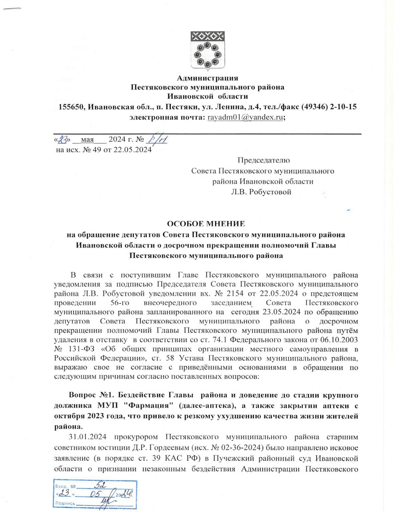 Совет Пестяковского района Ивановской области под командой Любови Робустовой 23 мая 2024 года досрочно прекратил полномочия главы муниципалитета Алексея Груздева «путем удаления в отставку» (о том, что нечто подобное скоро произойдет, мы предупреждали еще пару месяцев назад) и известил его об этом.