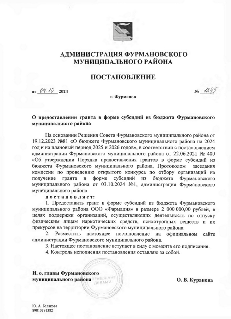 Данная субсидия была выделена с «абсолютно шикарной формулировкой» — «в целях поддержки организаций, осуществляющих деятельность по отпуску физическим лицам наркотических средств, психотропных веществ и их прекурсов на территории Фурмановского муниципального района».