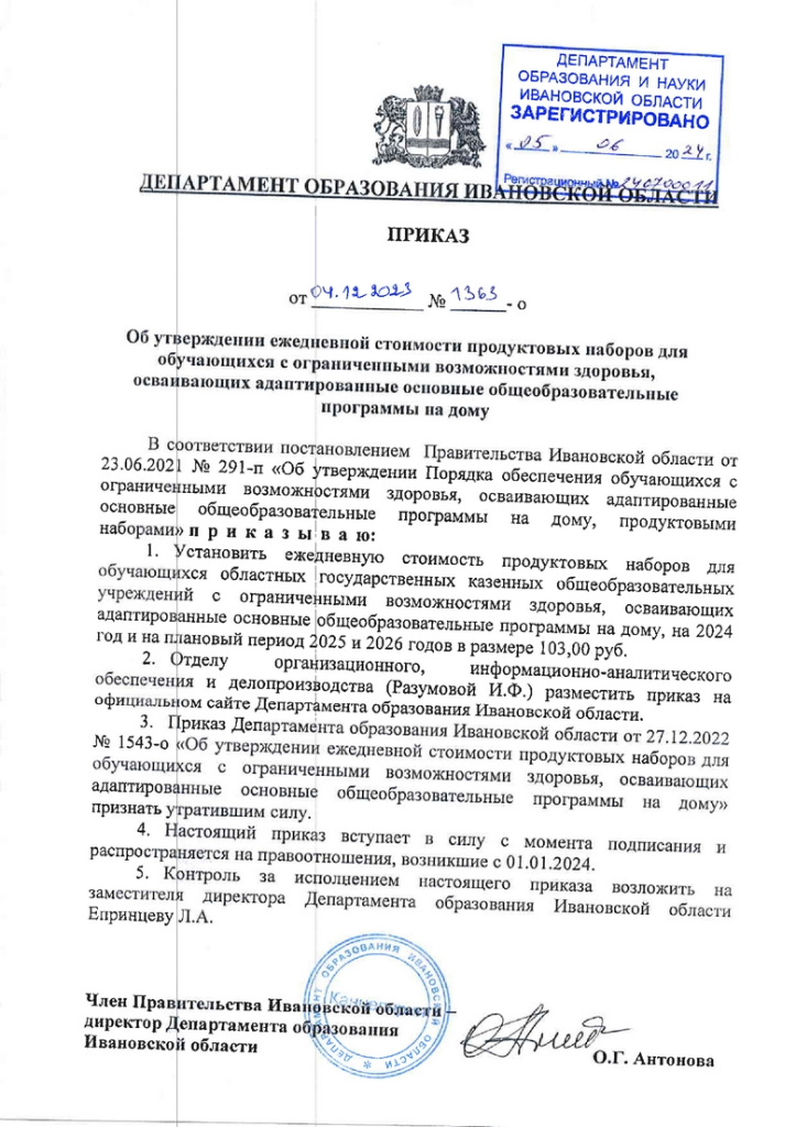 На днях был обнародован приказ департамента образования Ивановской области от 4 декабря 2023 года, устанавливающий новую ежедневную стоимость продуктовых наборов для обучающихся областных государственных казенных общеобразовательных учреждений с ограниченными возможностями здоровья, осваивающий адаптированные основные общеобразовательные программы на дому, на 2024 год и плановый период 2025 и 2026 годов.