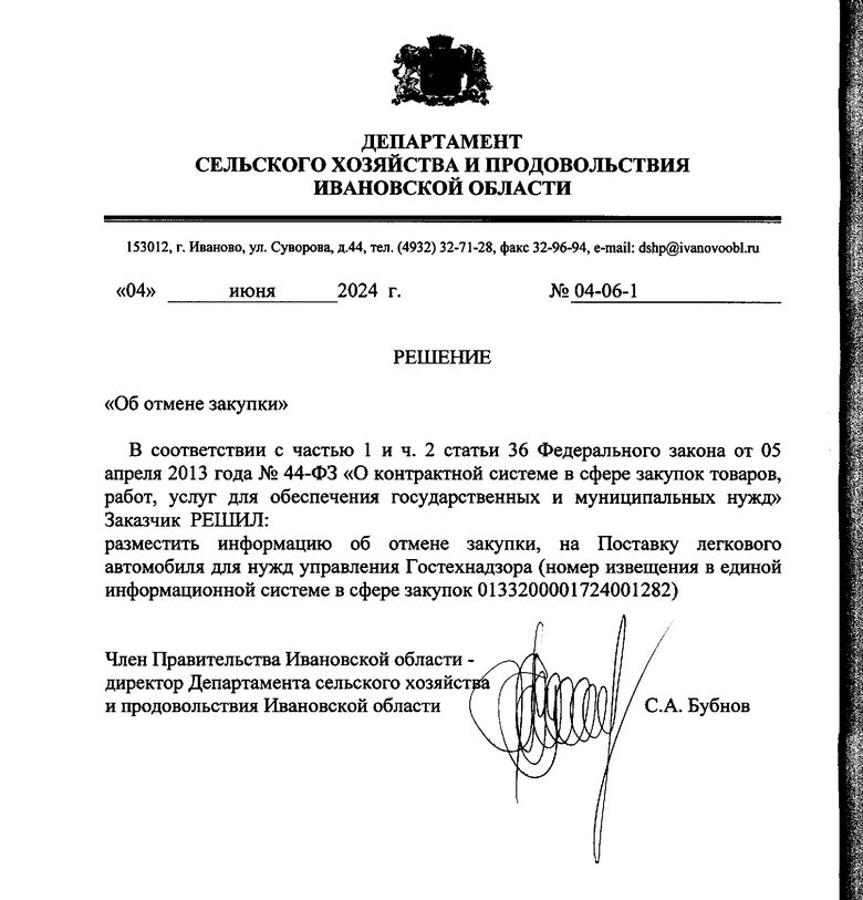 Департамент сельского хозяйства и продовольствия Ивановской области 4 июня отменил объявленный в конце мая аукцион на поставку легкового автомобиля для нужд управления гостехнадзора.