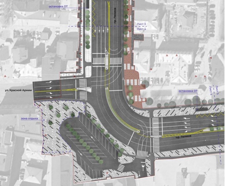 В мэрии хотят сделать здесь направляющие островки, которые, в том числе, будут отделять транспортный поток, поворачивающий направо. По словам Алексея Гадалова, на правый поворот на светофорах будет всегда гореть зеленая стрелка, так что водителям надо будет только пропустить пешеходов, а дальше можно будет ехать без особых препятствий. Другой вопрос, что, например, при повороте от памятника Борцам революции на ул. 10 Августа надо будет быстренько перестроиться в левые ряды, потому что почти сразу после поворота будет автобусная остановка и выделенная полоса для общественного транспорта.