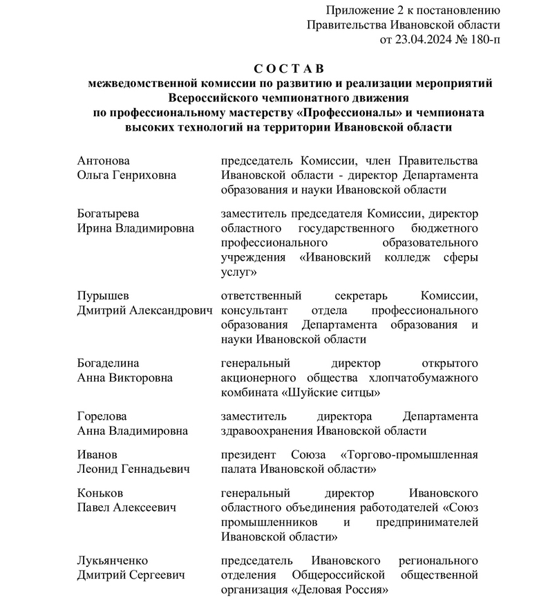 Среди членов комиссии – президент ТПП Ивановской области Леонид Иванов, гендиректор Союза промышленников и предпринимателей Ивановской области, экс-губернатор Павел Коньков, председатель ИРО ООО «Деловая Россия» Дмитрий Лукьянченко, гендиректор ОАО ХБК «Шуйские ситцы» Анна Богаделина и пр.