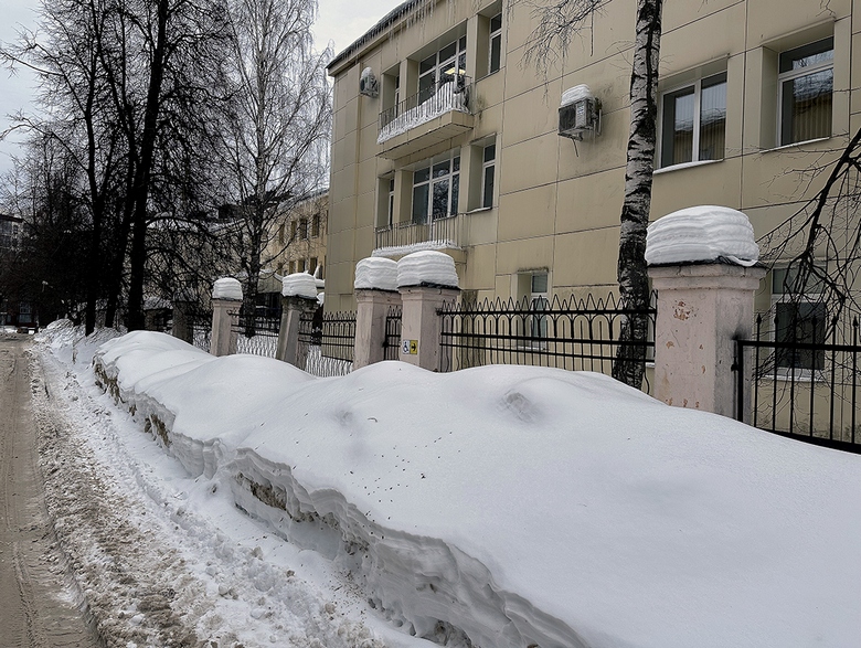 Пару раз трактора МБУ ДГХ или его подрядчиков вдоль кардиодиспансера все-таки проехали, причем отвал снега после расчистки оказался аккурат на газоне перед оградой диспансера. И сейчас это место выглядит так.