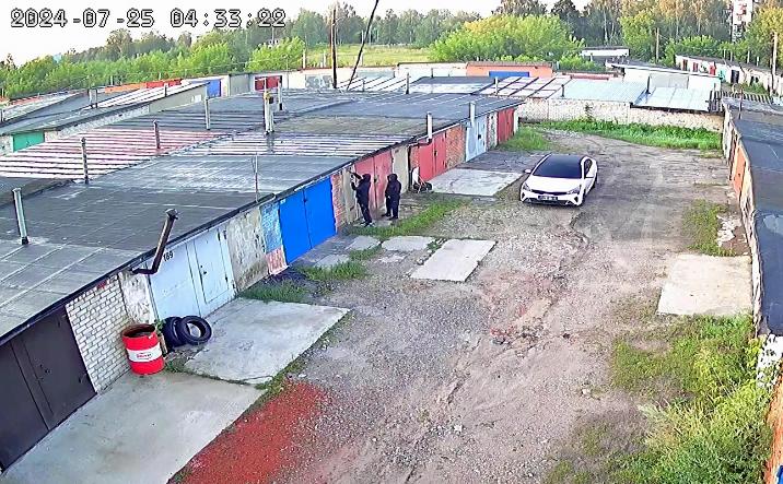 Двое мужчин передвигались на белом автомобиле Kia Rio с черной крышей и откидными номерами. Видеокамеры, установленные на столбах гаражного кооператива, зафиксировали все их действия. В определенный момент они пытались покинуть территорию, но, заметив автолюбителя в соседнем ряду, вернулись и продолжили осматривать гаражи, одновременно следя за автолюбителем.