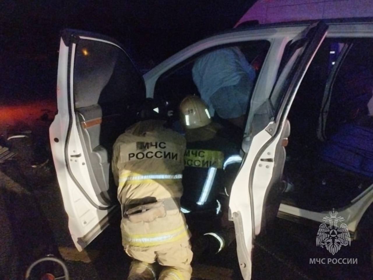 Двух пострадавших, зажатых в искореженной легковушке, из салона извлекали спасатели, применив гидравлический аварийно-спасательный инструмент.