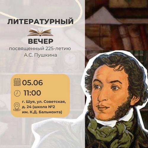 В среду, 5 июня, в 11:00 в Шуйской школе № 2 им. К.Д. Бальмонта (ул. Советская, д. 24) состоится литературный вечер, посвященный 225-летию А.С.
