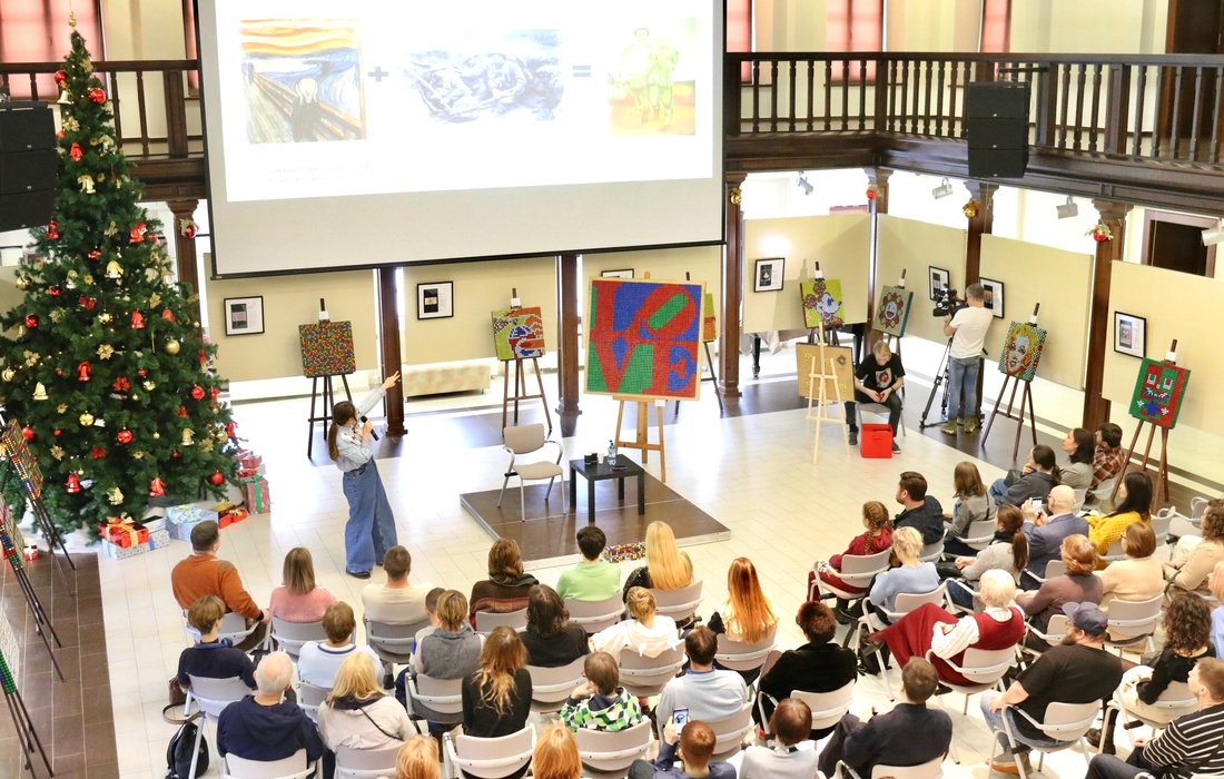 Цель лектора - расширить круг тех, кто может познать искусство третьим способом. Разговор проходит в Левитан-холле, пространство которого сейчас занимают концептуальные мозаики из кубиков Рубика. И эти мероприятия - выставка и лекция - логично дополняют друг друга. Автор работ - Андрей Маслов - прямо во время выступления Анастасии Четвериковой собирает новую картину из кубиков - "Танец" Матисса.