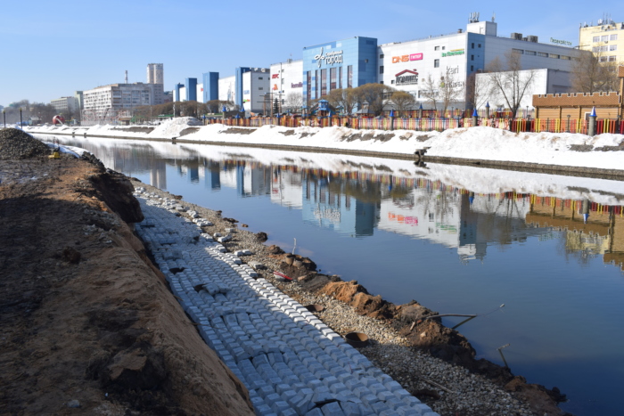 Продолжается ремонт пешеходной зоны набережной реки Уводь и восстановление габионов на участке в районе Соковского моста. В настоящее время ведутся работы по устройству основания под подпорную стенку. На песчаную подушку насыпается слой щебня, поверх которого укладывается гибкое железобетонное покрытие. Это инженерная конструкция, состоящая из бетонных блоков, соединённых между собой металлическими тросами. Она служит для укрепления берега. Подобная технология применяется в Иванове впервые.