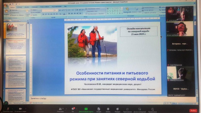 Уважаемые коллеги! В соответствии с проектом «Территория здоровья плюс», поддержанного Фондом президентских грантов, 15.05.2024 г. (среда) состоялась онлайн-консультация для общественных инструкторов, волонтеров и участников групп занятий по северной ходьбе на тему: «Особенности питания и питьевого режима при занятиях северной ходьбой» в рамках проекта «Территория здоровья плюс» Ивановской региональной организации Всероссийской организации ветеранов, поддержанного Фондом президентских грантов.