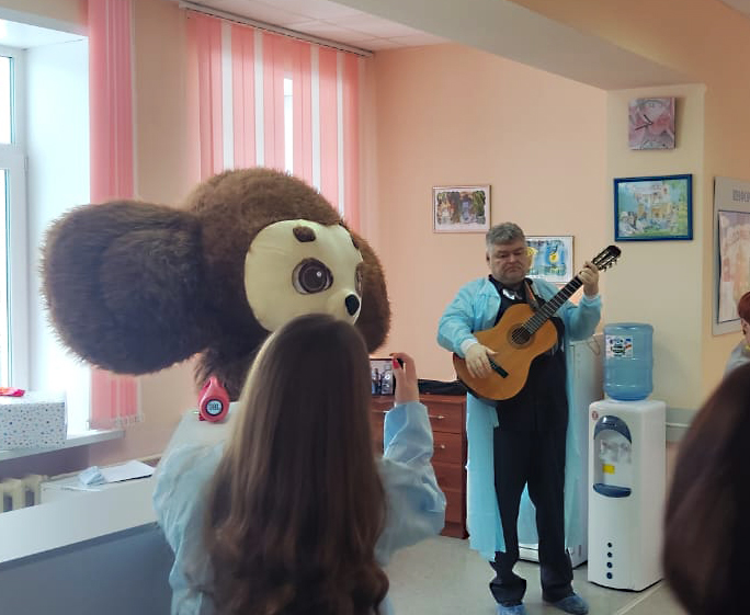 Среди гостей отделения были Чебурашка и композитор Михаил Андрейчиков. Они исполнили для маленьких пациентов веселые песни.