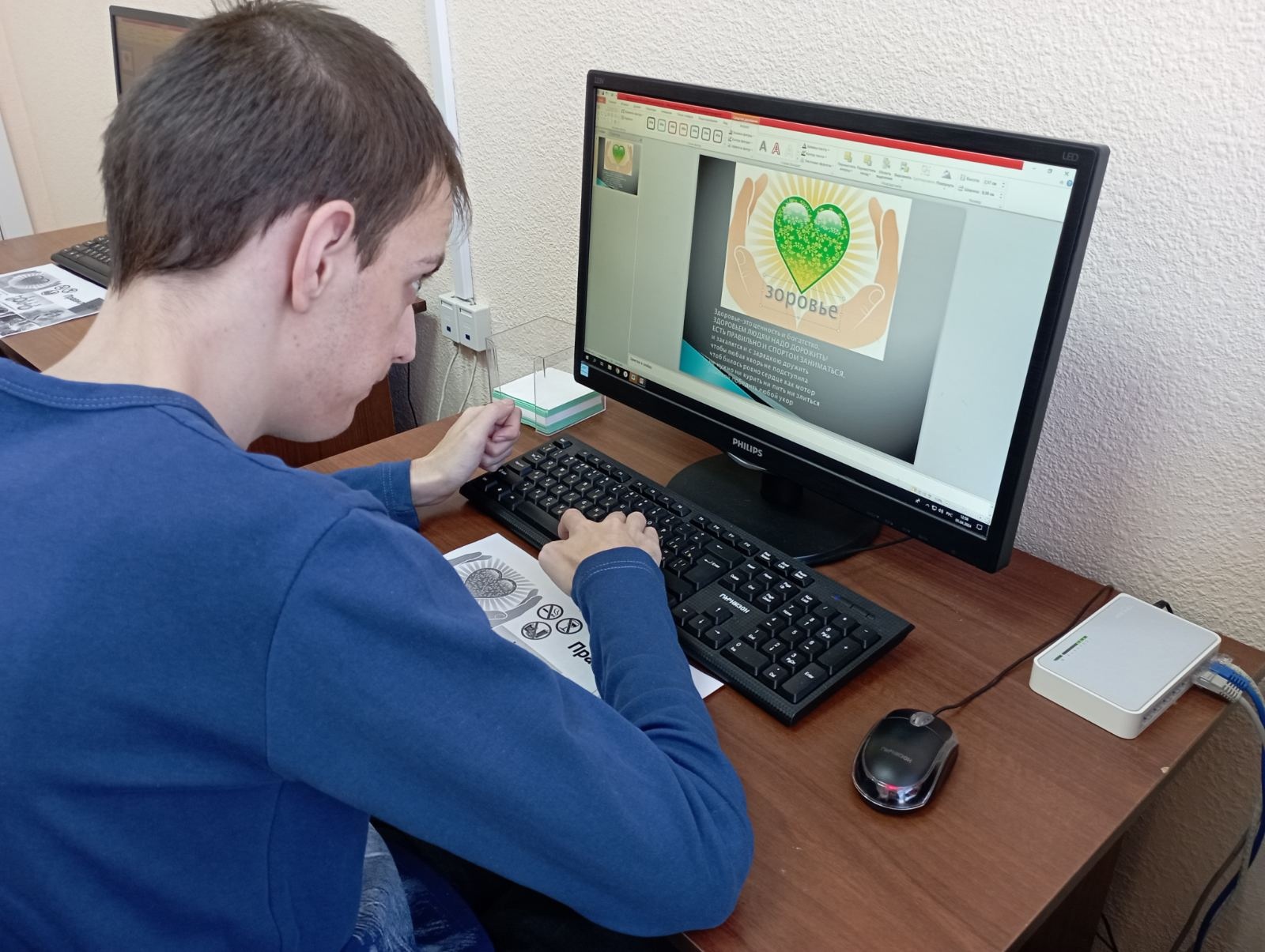 Каждому участнику было предложено сделать свой макет, посвященный здоровому образу жизни. Получатели услуг вспомнили работу с диалоговым окном, научились копировать и вставлять изображения, печатать текст и подбирать дизайн фона. В конце занятия каждый продемонстрировал свою работу.